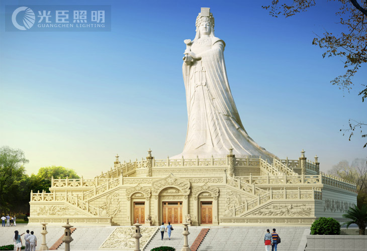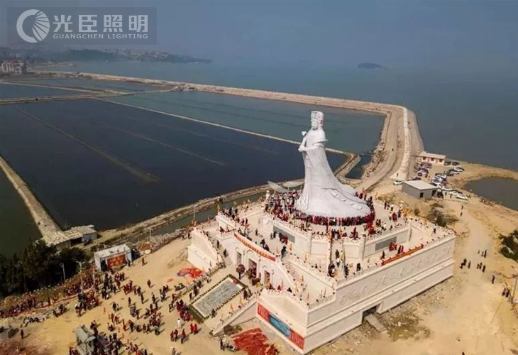 結(jié)合參照物體的亮化背景,媽祖像高度約30米左右,實現(xiàn)媽祖石像整體打亮,光臣照明為此定制一款大功率400W投光燈,DMX512金黃外控洗墻燈及LED藍光小射燈作為本次媽祖亮化燈具,在白總與光臣照明的同共努力下,效果呈現(xiàn)與設(shè)計方案效果還原度高達99%。