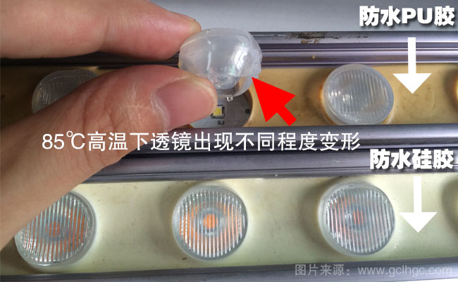 從圖片上我們能夠看到,灌封不同的防水膠,產(chǎn)品的變化也有所不同,最為明顯的是灌封經(jīng)過調(diào)制的PU防水膠,膠體固化加速較快,膠體和透鏡之間出現(xiàn)分離現(xiàn)象,透鏡在固化膠體的作用力下顯然被往上擠出膠體。并且散熱不及時的情況透鏡出現(xiàn)熱熔現(xiàn)象。