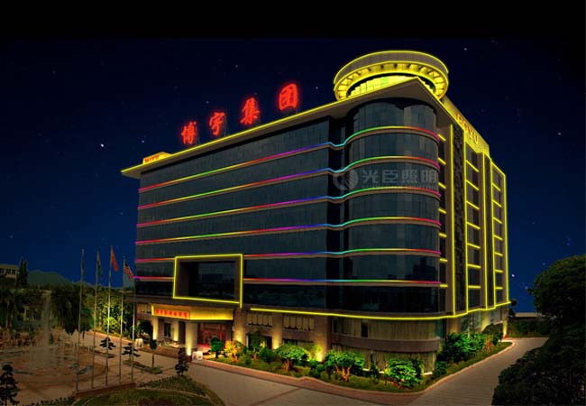 博宇集團(tuán)是一家水族器材、園林造景配套器材及寵物用研發(fā)、銷售一體的高新技術(shù)企業(yè),其主體辦公大樓更是周邊的地標(biāo)性建筑。此次亮化工程是屬于換新項(xiàng)目,以前的效果是用白光的高壓PC護(hù)欄管做的一個輪廓,效果比較單調(diào),并且由于很多護(hù)欄管防水沒做好,壞了很多,所以需要更換全新的亮化燈具。