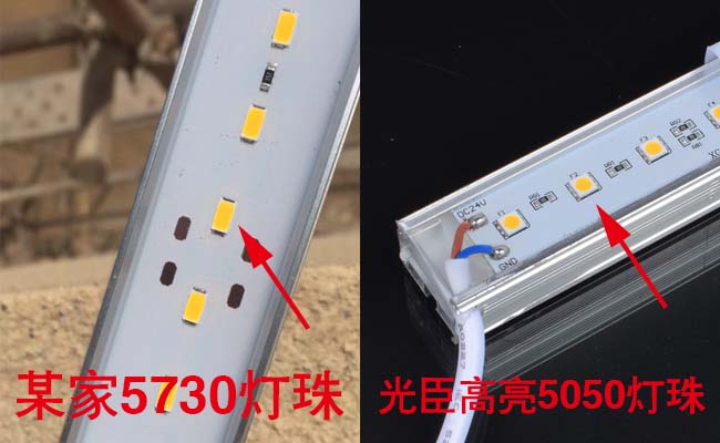 (1)光源的選用:多次與追求利潤(rùn)更大化的朋友,請(qǐng)不要忽略品質(zhì)!出問題的時(shí)候得不償失!從圖片上看這根線條燈是用5730燈珠作為燈具光源,我們不是說5730燈珠不好,用在室內(nèi)燈具生產(chǎn)上它也是個(gè)好光源。光臣照明所生產(chǎn)的LED線條燈一律不采購(gòu)5730燈珠作為光源,主要以5050晶元、三安、3030歐司朗、3535外露燈珠、科銳、普瑞等等戶外燈具專用光源。