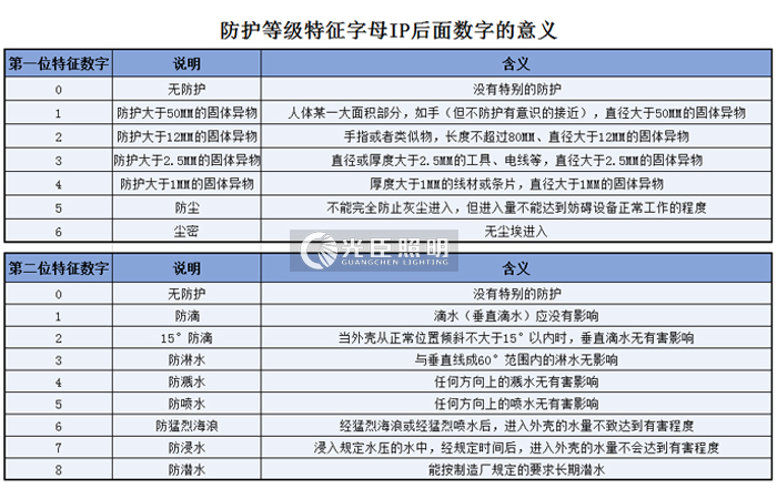 光臣智科同樣沿用國(guó)際上采用的字母“IP”(International protection)后面跟兩個(gè)數(shù)字來(lái)表示燈具的防塵、防水等級(jí)。前一位數(shù)字表示對(duì)人、固體異物或塵埃的防護(hù)能力,后一位數(shù)字表示對(duì)水的防護(hù)能力,見(jiàn)下圖: