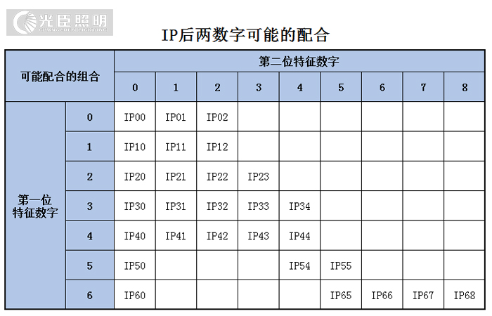 顯然,LED亮化燈具在防塵能力和防水能力之間存在一定的依賴(lài)關(guān)系,也就是說(shuō)前一位數(shù)字和后一位數(shù)字之間有一定的依存關(guān)系,大家看小編為大家整理的下面這張結(jié)合配圖: