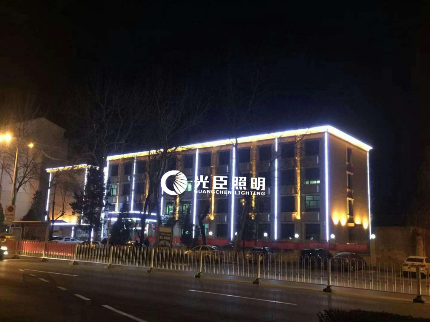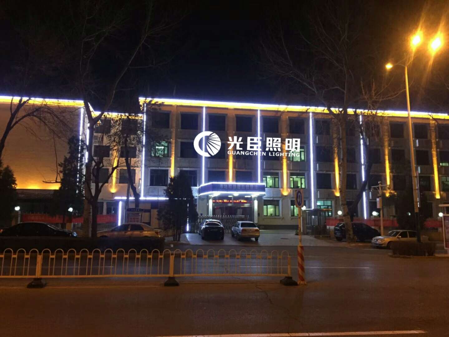 本次亮化主要是以LED白光線條燈做建筑輪廓亮化,柱子用金黃光窄光投射燈,客戶對(duì)整體效果和亮度都很滿意。