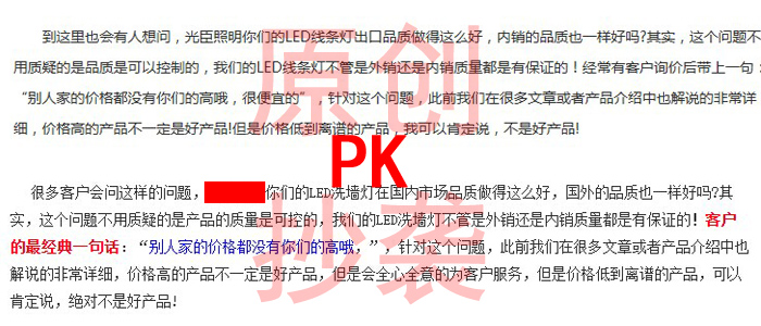 瀏覽:-我們年輕,我們敢創(chuàng)新,這是光臣人的作風(fēng),光臣照明因?yàn)樵缭?年前就開(kāi)始生產(chǎn)洗墻燈,在行內(nèi)的名氣較大,所以一直以來(lái)所生產(chǎn)的產(chǎn)品都是被模仿的對(duì)象,近期發(fā)現(xiàn),就連光臣官司方網(wǎng)站的文章都不斷的被同行抄襲,甚至照搬。